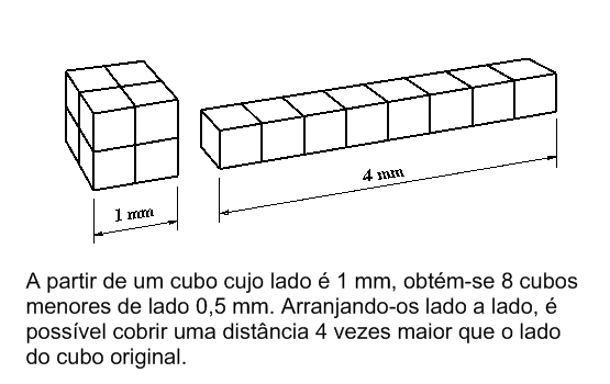 A fim de pensar sobre esse método, nós lançaremos uma hipótese de que os átomos têm um diâmetro D – 0,1 mm. Neste caso, o número de átomos presentes no cubo poderia ser igual a: 10 x 10 x 10 = 1000. Posicionando os 1000 átomos em uma fileira, nóscalculamos o comprimento: 1000 x 0,1 = 100 mm.