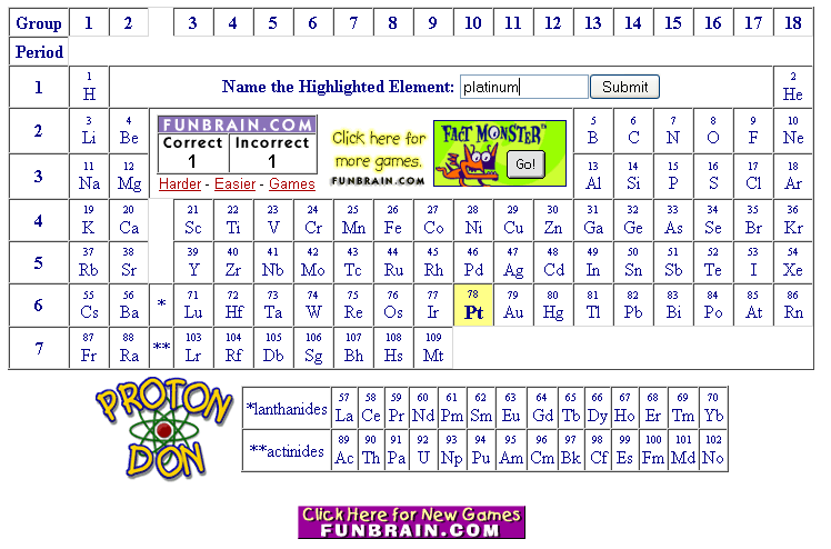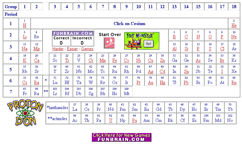 Chama-se “Proton Don”, e tem um simpático ratinho como apresentador das atividades. É possível jogar de duas maneiras: 1. O nome do elemento é fornecido e você tem que clicar na posição que ele ocupa na tabela periodica; 2. Um símbolo químico é fornecido e você tem que escrever o nome correto dele (em inglês, é facim, facim). Cada uma dessas duas atividades conta com três níveis de dificuldade: Most Common Elements (fácil), Common Elements (médio) e All Elements (difícil). Visite o site do jogo e divirta-se por alguns minutos, tenho certeza que você aprenderá finalmente onde fica cada elemento, e ainda pode aproveitar para memorizar os nomes deles em inglês. 😛