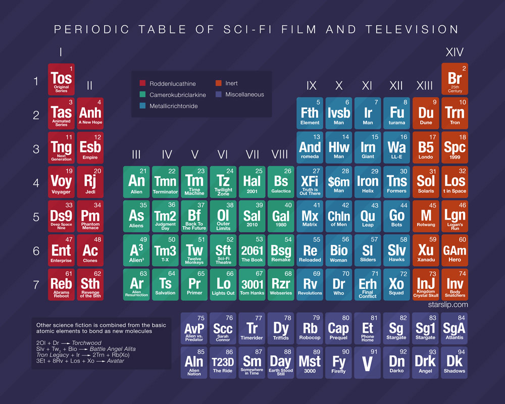 Como um grande fã de séries de ficção científica, fiquei bem contente em encontrar essa tabela periodica que lista diversas das séries que eu assisto (ou assistia quando tinha tempo livre na vida).