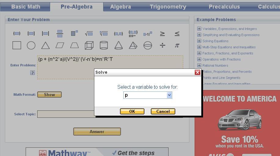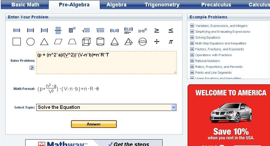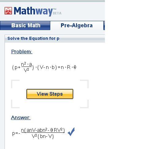 Peguei a equação de Van der Waals para gases reais e digitei no Mathway.