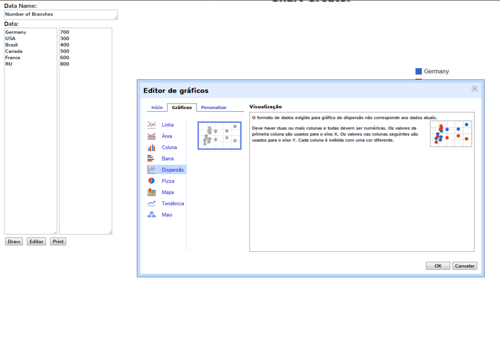 Clique no botão “Editor” e você pode obter gráficos de linhas, pontos de dispersão e vários outros.