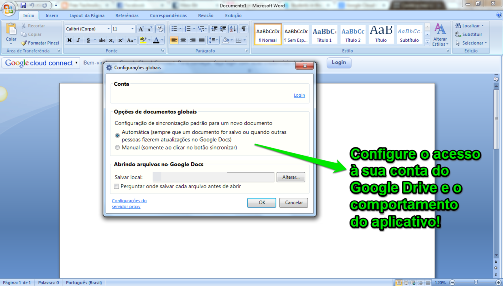 No primeiro uso, você precisará configurar a forma de acesso ao Google Drive e a pasta onde seus arquivos do MS Office serão armazenados (ver a próxima imagem).