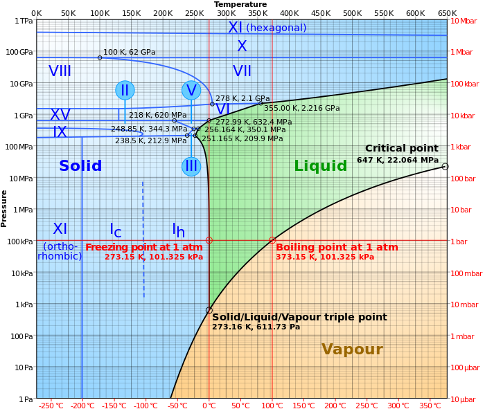 Analisando o diagrama de fases da água, pode-se constatar que para uma pressão de 1 atmosfera (que é a pressão da atmosfera do nosso planeta ao nível do mar e equivale a 1,01325 bar) a temperatura de ebulição (ou fervura) da água é 100,0ºC (veja o ponto marcado em amarelo no diagrama abaixo).