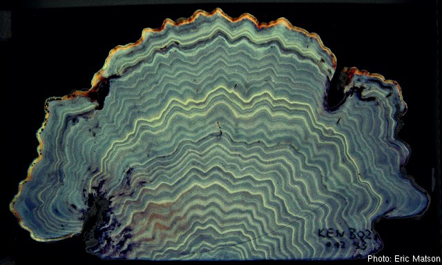 5. Análise Isotópica do Oxigênio na Calcita de Conchas e Corais[30][31]: Da mesma maneira que a composição da água nos gelos profundos extraídos reflete a composição isotópica do vapor de água da atmosfera, de forma reversa a composição isotópica dos carbonatos marinhos reflete a da água dos oceanos. Assim, a medição da fração entre 16O e 18O em carbonatos extraídos nas profundezas marítimas permite saber a temperatura média a que aqueles organismos foram submetidos quando vivos. Esta análise também permite se recuar no tempo até 500 milhões de anos no passado![9]