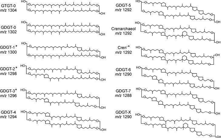 7. TEX86[47][48][49][50][51][52][53]: Mais um pouco de taxonomia biológica. Outro Reino pouquíssimo conhecido (mas de existência e validade não debatidas!) é o Reino Crenarqueonte[54], que faz parte do Domínio das Arquéias[55] (que por sua vez foram separados do antigo Reino Monera[56] ainda em 1977[38][39]… A evolução do nosso entendimento de Taxonomia seria suficiente pra escrever um épico de história mais interessante que “Game of Thrones”!) e tem como um de seus Filos o chamado “Filo Thaumarqueonte”[57]. Aqui estamos lidando em grande parte já com os chamados “Extremófilos”[58], ou seja, seres vivos capazes de viver em condições que a maior parte da vida atual do planeta considera intoleráveis (mas que por sua vez eram tão comuns alguns bilhões de anos no passado que pode ser que sejam estes os seres que carreguem a chave para compreendermos o surgimento da vida no planeta), inclusive os “hipertermófilos”[59] (seres para os quais a temperatura “começa a ficar boa” a partir de 60°C, o ideal é a partir de 80°C, e não se incomodam em muitos casos em simplesmente passar de 100°C). Porém, os Thaumarqueontes[57] formam um filo de seres “mesofílicos”[60] (que vivem em temperaturas entre 20°C e 45°C) desse reino. Bom, mas vamos ao que importa realmente: A membrana plasmática desses seres, assim como de qualquer outro ser vivo de nosso planeta, é formada por lipídios (moléculas de gordura). Porém, nesse filo ela é composta de uma classe de lipídios bastante específica, os glicerol-dialquil-glicerol-tetraéteres (GDGT), caracterizados pela presença de nenhum à 3 ciclopentanos (com exceção do “crenarqueol”, que contém 4 ciclopentanos e 1 ciclohexano, e portanto pode ser facilmente distinto). De forma similar à da análise anterior, o “grau de ciclização” é dependente da temperatura em que aquela alga específica viveu, e basicamente se quantifica a proporção de ciclização 1 à 3 da amostra (ignoram-se as GDGT-0 e GDGT-4 por diferentes motivos) para medir essa temperatura. Esse paleotermômetro é capaz de informar a temperaturas de “prontuários” de até 160 milhões de anos atrás.[47][53]