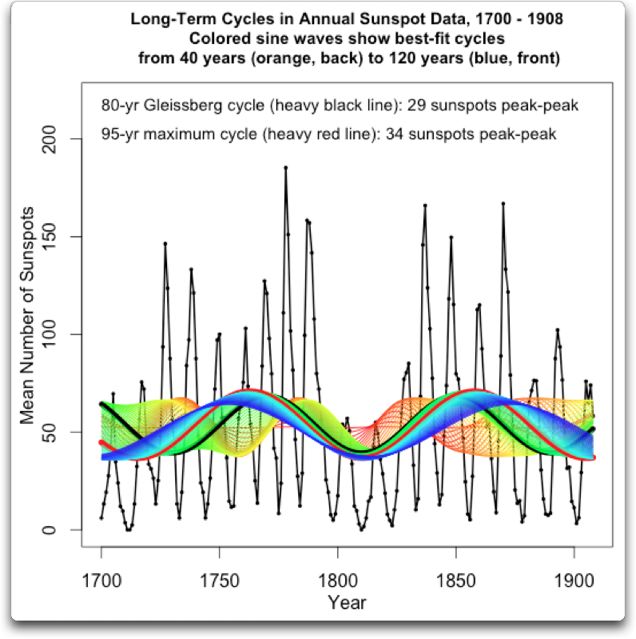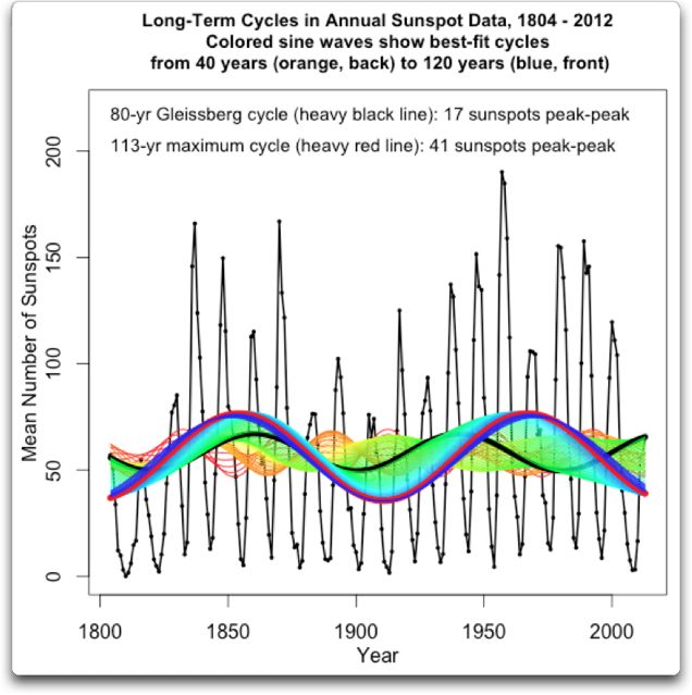 É pouco? Não. Temos ainda motivos para supor que o Ciclo de Gleissberg simplesmente NÃO EXISTE, e é um mero artefato matemático dos métodos de “suavização” dos dados aplicados, e o primeiro desses motivos já foi mostrado: a mudança no tamanho da periodicidade! Estudos mais recentes indicam que em dois séculos o ciclo teria se “alargado” dos 88-90 anos originais para 113 anos![74][75] É isso mesmo, só comparar os resultados de suavização aplicadas ao período 1700 à 1908 ao lado, com o que se observa no período 1804 à 2012 abaixo: o primeiro aponta para um ciclo de 95 anos como o melhor ajuste, enquanto que no segundo o ciclo aparenta ter 113 anos, quase 20 anos a mais! Isso é absolutamente incompatível com o que qualquer um esperaria um ciclo com comportamento periódico! E, como tal, parece indicar algo fantástico: o ciclo simplesmente não existiria.[74][75] Na verdade, parece que estamos lidando apenas com mais um clássico caso da busca incessante do cérebro humano por padrões mesmo onde eles não existem, e que tem como resultados interessantes a famosa pareidolia[76].