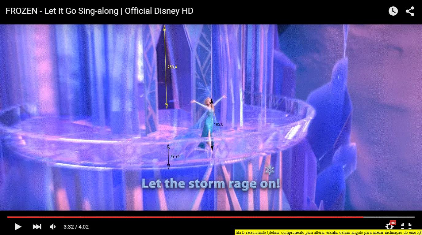 Agora, eu subo essa imagem para o software de vídeo-análise OSP Tracker e adiciono uma fita de calibração sobre a imagem da Princesa/Rainha Elsa para informar ao software que ela mede 1,62 m de altura.