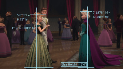 No clip da música-tema do filme, “Let it go”, existem duas cenas que me permitirão estimar o tamanho do castelo: