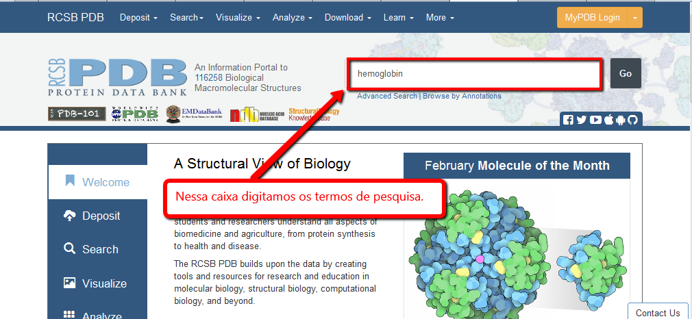Fui ao site do PDB (http://www.pdb.org) e digitei hemoblobin na caixa de buscas.