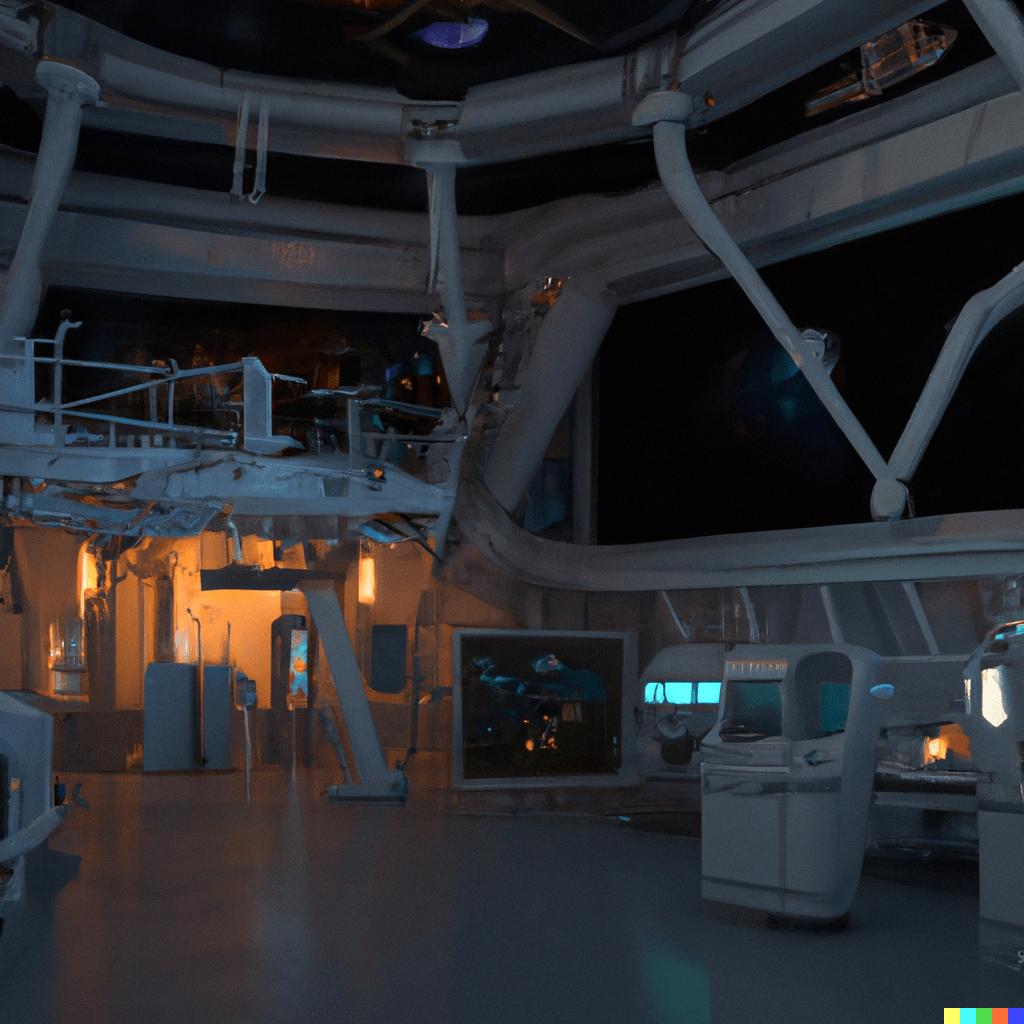 Eu fiz o seguinte pedido para o Chat GPT; “crie um prompt para gerar uma imagem de um laboratório de pesquisas alienígena cheio de computadores e luzes piscantes em que dois personagens possam aparecer em primeiro plano”